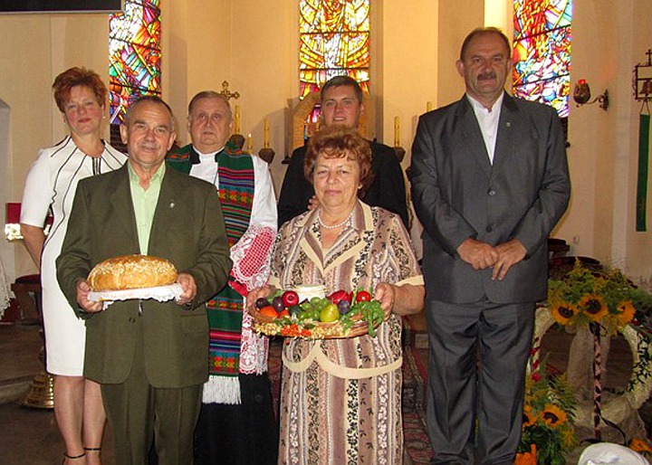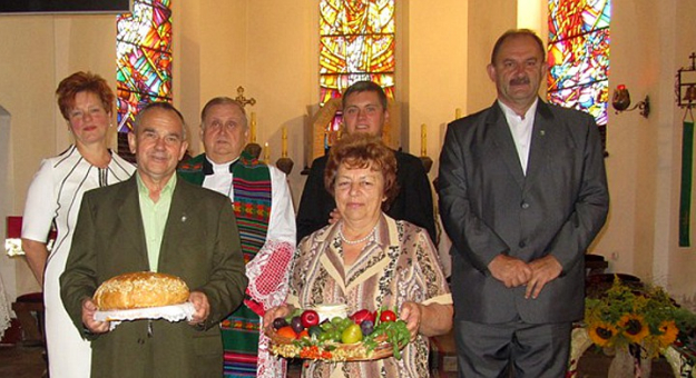 Starostowie dożynek - Adam Haładus i Genowefa Tyszkowska w imieniu rolników poprosili o pobłogosławienie tegorocznych zbiorów: chleba, warzyw i miodu.