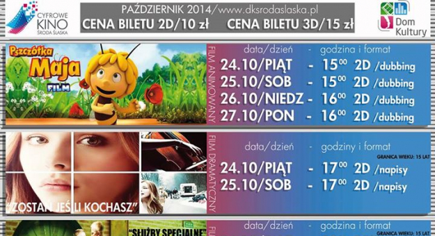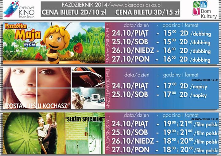 Od piątku do poniedziałku w godzinach popołudniowych na ekranie kina wyświetlana będzie pełnometrażowa wersja Pszczółki Mai. W piątek i sobotę, tuż po przygodach pasiastego owada, czekać będzie na Was nieśmiała i utalentowana muzycznie nastolatka, zawieszona przez jeden dzień między życiem a śmiercią. W filmie "Zostań, jeśli kochasz" zagra ją Chloë Grace Moretz. Wieczorami zapraszamy natomiast na polski film "Służby specjalne" z Olgą Bołądź w roli głównej.
