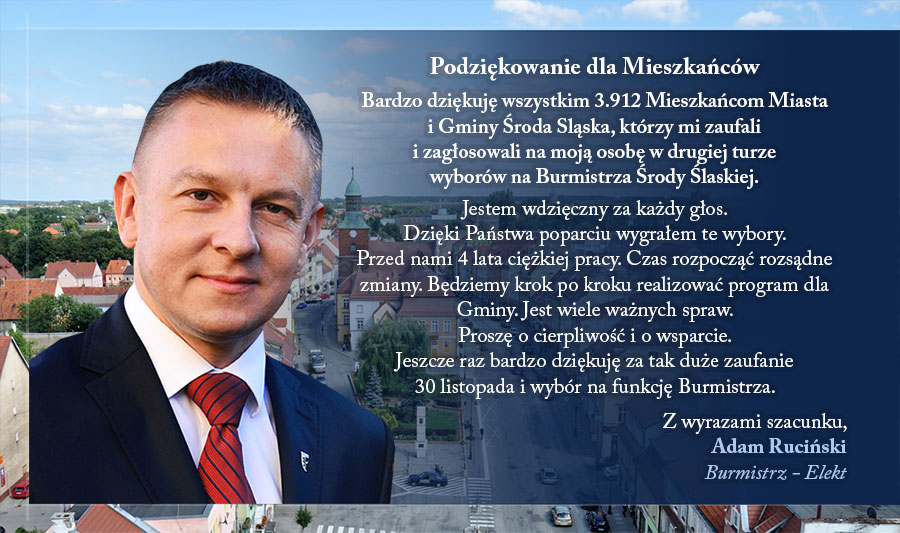 Podziękowania dla Mieszkańców Miasta i Gminy Środa Śląska, którzy oddali głos na Adama Rucińskiego w wyborach samorządowych 2014.
