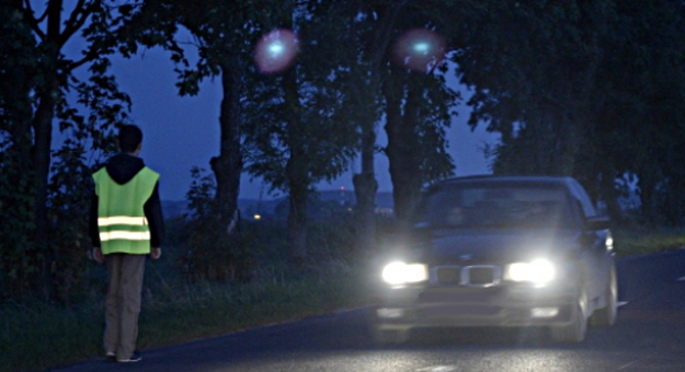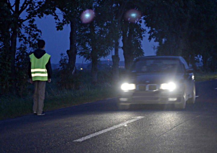 Po zmroku pieszy ubrany w ciemny strój jest widziany z odległości około 40 metrów. Natomiast osoba mająca na sobie elementy odblaskowe jest widoczna ze 150 metrów fot.: policja