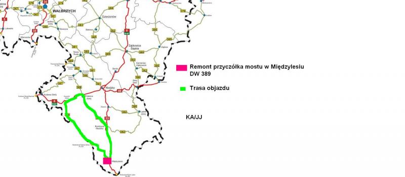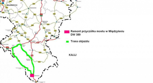 Podczas naprawy mostu obowiązuje objazd drogą wojewódzką nr 389 do Zieleńca, następnie drogą krajową nr 8 do drogi wojewódzkiej nr 388, a nią do drogi krajowej nr 33 Remont wykona Przedsiębiorstwo Budowlane „CAKO” sp. z o.o. z Polanicy Zdroju. Koszt prac budowlanych to 425 tyś zł. Środki pochodzą z budżetu województwa.