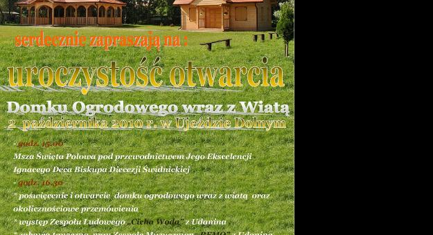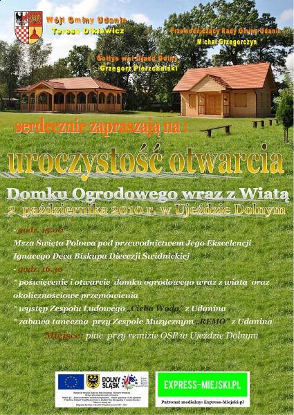 Wójt Gminy Udanin Teresa Olkiewicz, Przewodniczący Rady Gminy Udanin Michał Grzegorczyn, Sołtys wsi Ujazd Dolny Grzegorz Pierzchalski oraz Espress-Miejski.pl serdecznie zapraszają na uroczystość otwarcia nowo powstałego domku ogrodowego wraz z wiatą, dofinansowanego w ramach PROW na lata 2007-2013, która odbędzie się w dniu 2 października 2010 r. na placu przy remizie OSP w Ujeździe Dolnym.