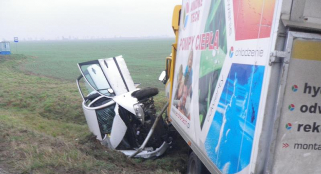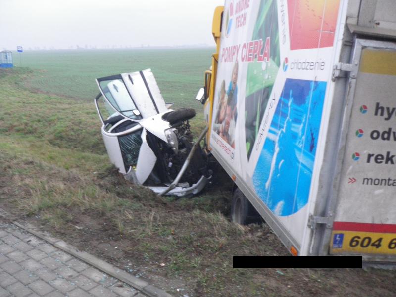 W wyniku zderzenia z samochodem półciężarowym, samochód osobowy przewrócił się na bok i wpadł do rowu. Przybyli na miejsce średzcy strażacy, przecięli pasy, a następnie wydostali przez okno uszkodzonego pojazdu osobę poszkodowaną. Kierowca pojazdu został przekazany pogotowiu i przewieziony do szpitala we Wrocławiu. Wypadek miał miejsce 27 listopada.