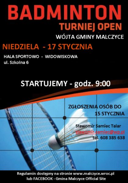 "Badminton Turniej Open" wójta Gminy Malczyce odbędzie się w niedzielę, 17 stycznia, od godziny 9 w Hali Widowiskowo-Sportowej w Malczycach przy ulicy Szkolnej 6. Osoby zainteresowane udziałem w turnieju jeszcze dzisiaj mogą zgłaszać swój akces.