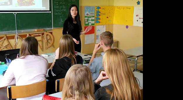 Wolontariuszka z Chin opowiadała o kulturze swojego kraju i uczyła gimnazjalistów sztuki walki. Uczniowie nauczyli się też jeść pałeczkami.