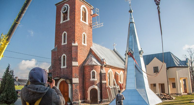 Akcja montażu trwała przeszło dwie godziny. Punktualnie o godzinie 9. konstrukcja znalazła się na docelowym miejscu. - Koszt tych prac to 80 tysięcy złotych. Praktycznie całość pokryje firma ubezpieczeniowa. Część dołożyli też mieszkańcy - mówi Grażyna Plich z rady parafialnej.
