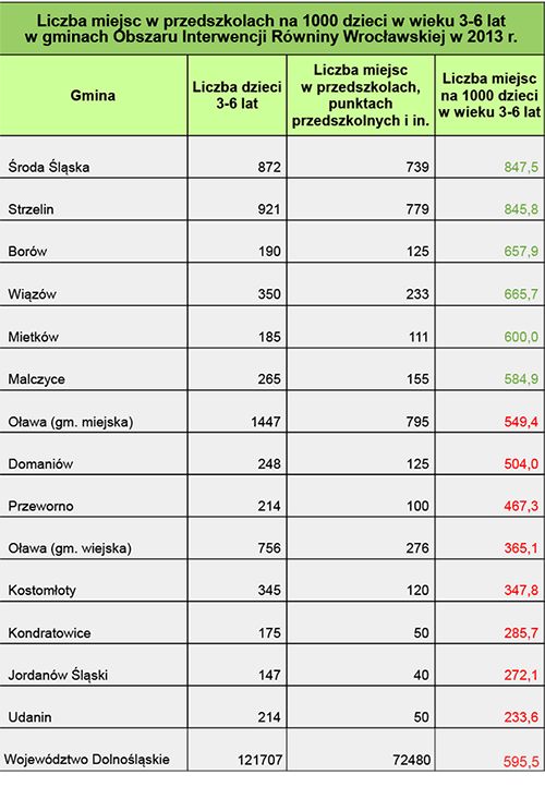 Paradoksalnie jednak, pierwsza lokata w rankingu ilości miejsc przedszkolnych nie jest dla nas korzystna dla aplikowania o środki unijne. Z jednej strony jest dowodem na to, że Gmina Środa Śląska dba o najmłodszych, z drugiej jednak tak wysoki wskaźnik pozbawia nas cennych punktów w aplikowaniu o środki unijne na budowę lub rozbudowę przedszkoli. Punkty w trakcie oceny wniosków o dofinansowanie unijne w naszym województwie przyznawane są wnioskom tych gmin, które mają najniższe wartości wskaźników czyli np. Kondratowice, Jordanów Śląski, czy Udanin.