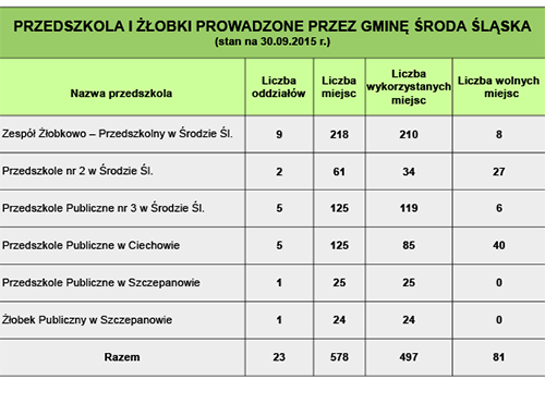 Według najnowszych badań prowadzonych przez Instytut Rozwoju Terytorialnego we Wrocławiu wskaźnik liczby miejsc w przedszkolach i punktach przedszkolnych na 1000 dzieci w wieku 3-6 lat, w przypadku Gminy Środa Śląska wynosi 847,5. Daje nam to pierwszą lokatę wśród 14 miast i gmin Obszaru Interwencji Równiny Wrocławskiej.