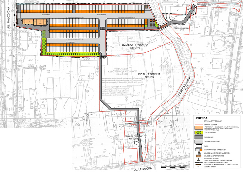 W międzyczasie pojawił się nawet pomysł, aby zmienić lokalizację targowiska i przenieść je na działkę sąsiadującą z Biedronką. Z planów jednak zrezygnowano, ponieważ samo wyrównanie tego terenu pochłonęłoby niebagatelną kwotę około 2 mln złotych. Ostatecznie zdecydowano się na przebudowę obecnego miejsca. Kilka dni temu gmina opublikowała zapytanie ofertowe dotyczące opracowania projektu przebudowy targowiska i utworzenia lokanego rynku rolno-spożywczego. Wcześniej przygotowała koncepcję zagospodarowania terenu. Wedle jej zapisów możemy się spodziewać, że po zakończeniu inwestycji między stoiskami poruszać się będziemy po wybrukowanych alejkach, wzdłuż których stanie 60 stoisk niezadaszonych i 47 zadaszonych. Dodatkowo powstanie piętrowy budynek, w ktorym znajdą się biura administracyjne, toalety, pomieszczenia magazynowe, przymierzalnie, mini bar oraz portiernia.