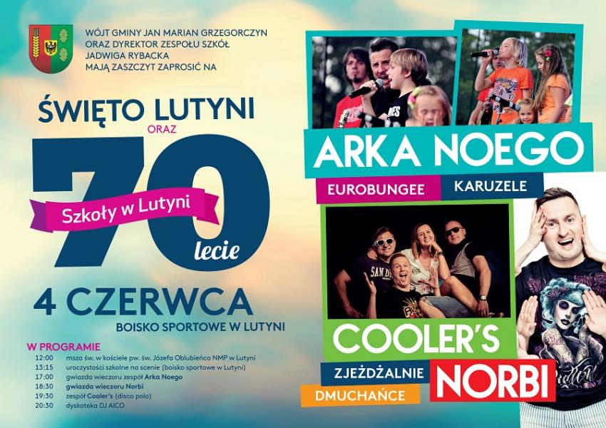 O godzinie 12 przewidziano mszę świętą w kościele w Lutyni. Tuż po mszy zostanie wkopany kamień węgielny pod budowę kompleksu szkół. kwadrans po 13 na boisku sportowym odbędą się uroczystości szkolne. Pierwsza gwiazda - Arka Noego - wystąpi o godzinie 17, natomiast Norbi pojawi się o 18.30. Przed dyskoteką, która rozpocznie się o 20.30, wystąpi zespół Cooler's (19.30).