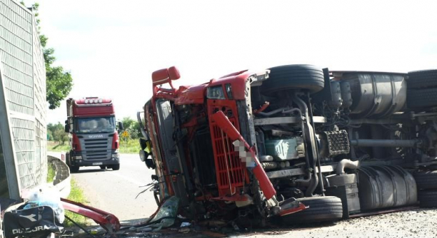 Policja i straż pożarna informację o zdarzeniu otrzymały około godz. 9 od Centrum Powiadamiania Ratunkowego we Wrocławiu. Na 65 km drogi krajowej 94 doszło do kolizji z udziałem dwóch samochodów. – Jednym z nich był samochód ciężarowy marki Volvo. Tir jechał w kierunku Wrocławia i chcąc uniknąć zderzenia z jadącym z naprzeciwka samochodem, gwałtownie skręcił i przewrócił się na jezdnię – informuje Marta Stefanowska, rzeczniczka średzkiej policji. W wyniku wypadku nikt nie ucierpiał.