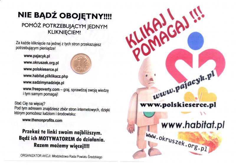 Młodzieżowa Rada Powiatu Średzkiego zaprasza wszystkich chętnych i chcących pomóc potrzebującym do udziału w akcji „Klikaj i pomagaj”.
