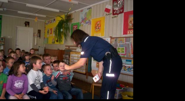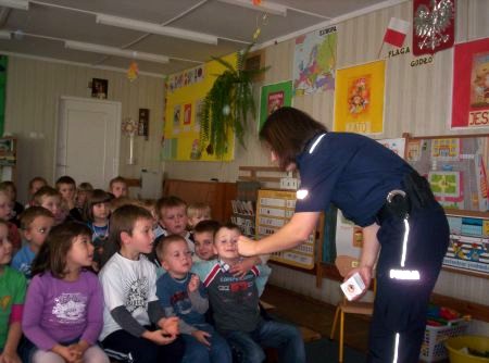 Przedszkolaki w wieku 5-6 lat poznały podstawowe zasady bezpiecznego zachowania na drodze. Policjant omówił z dziećmi najczęściej spotykane zagrożenia oraz sposoby radzenia sobie w trudnych sytuacjach np. w kontakcie z agresywnym bezpańskim psem. Dzieci dowiedziały się też, co może zrobić dziecko, gdy się zagubi lub zaczepi je nieznana osoba. Jak się zachować, gdy zostaną same w domu i ktoś zapuka do drzwi mieszkania. Tematem spotkania były też numery alarmowe, które każde dziecko powinno znać. Dzieci aktywnie uczestniczyły w spotkaniu, opowiadały o własnych doświadczeniach oraz zadawały pytania. Ponadto interesowała je praca policjanta oraz umundurowanie. Na koniec maluchy otrzymały naklejki z Komisarzem Lwem.