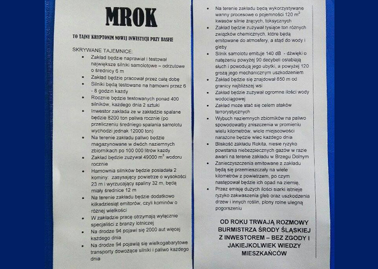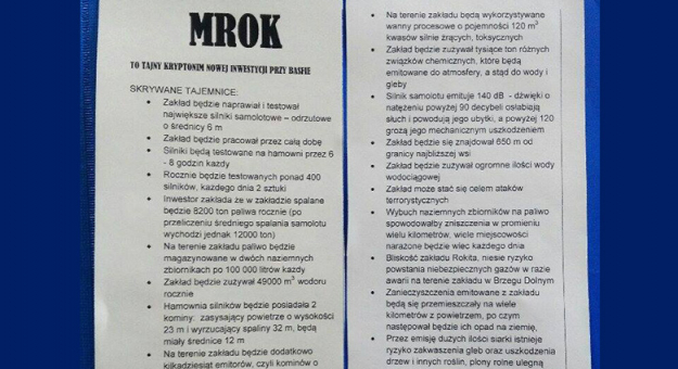 - Od roku trwają rozmowy z inwestorem z branży lotniczej, który w naszym sąsiedztwie planuje wybudowanie zakładu serwisowania i naprawy silników lotniczych. My, jako mieszkańcy, dowiedzieliśmy się o tym dopiero teraz i to głównie dzięki mediom. Nie są znane praktycznie żadne szczegóły dotyczące tej inwestycji. Wiemy że zostanie zbudowany ponad trzydziestometrowy komin, staną tam też dwa gigantyczne zbiorniki na paliwo wysokooktanowe. Rocznie serwisowanych będzie około 400 silników. Zakład będzie pracować 24 godziny na dobę. Będzie hałas, zostanie zanieczyszczone powietrze oraz gleba, a przez to i woda. Boimy się o zdrowie. Nasze, naszych dzieci i wnuków. Wyrażamy zdecydowany sprzeciw wobec tej budowy!!! Dość szkodliwych ekologicznie inwestycji w naszej gminie!!! - czytamy w komunikacie organizatorów protestu zamieszczonym na facebookowej stronie wydarzenia [klik]