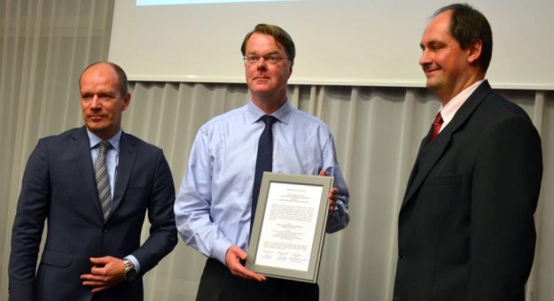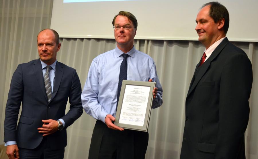 We wtorek 20 grudnia - podczas konferencji prasowej - prezes Legnickiej Specjalnej Strefy Ekonomicznej Witold Lech Idczak wręczył Thomasowi Böttgerowi dyrektorowi zarządzającemu XEOS zezwolenie na prowadzenie działalności w LSSE fot.: LSSE