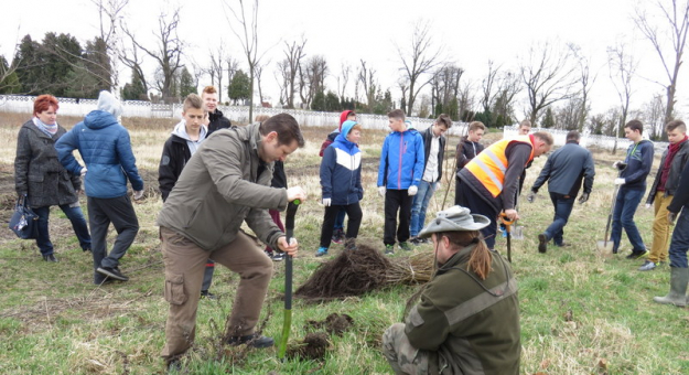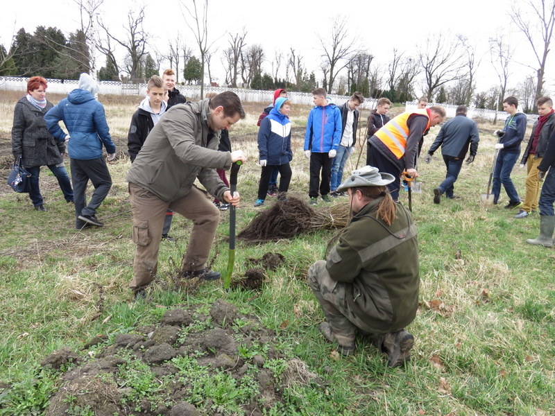 Wójt gminy Malczyce i gimnazjaliści z Malczyc, zasadzili drzewka przy pomocy nadleśniczego Łukasza Pyry.