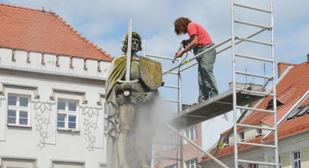W tym tygodniu firma Maszkaron rozpoczęła prace przy pomniku. Dziś rycerz był czyszczony. - Priorytetem prac konserwatorskich jest powstrzymanie czynników działających na obiekt destrukcyjnie - mówi Krystian Kopka zastępca kierownika Wydziału Gospodarki Nieruchomościami i Architektury Urzędu Miejskiego w Środzie Ślaskiej. Najistotniejsze będzie właściwe zabezpieczenie obiektu przed szkodliwym działaniem wody opadowej i przenoszonej instalacji fontanny. - Z ograniczeniem bezpośredniego działania wody na obiekt wiąże się zapobieżenie infekcji biologicznej. Najważniejszym zadaniem jest zabezpieczenie elementów rozszczelnionych oraz wszelkich płaszczyzn poziomych przed działaniem wody. Uporządkowanie gospodarki wodnej w otoczeniu pomnika zagwarantuje dobry stan zachowania zabytku na długie lata - czytamy w programie prac konserwatorskich.
