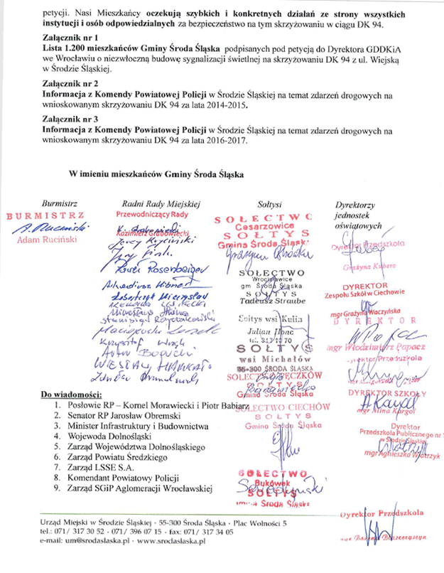 Urząd Miejski w Środzie Śląskiej skierował pismo do wiadomości Ministra Infrastruktury i Budownictwa, posłów Piotra Babiarza i Kornela Morawieckiego, senatora Jarosława Obremskiego, Zarządu Województwa Dolnośląskiego, Wojewody, Legnickiej Specjalnej Stefy Ekonomicznej, Zarządu Powiatu Średzkiego oraz Agencji Rozwoju Aglomeracji Wrocławskiej. Akcja zbierania podpisów pod petycją odbyła się przy mocnym wsparciu organizacyjnym Dyrekcji i Pracowników Przedszkola w Ciechowie, za co władze Gminy Środa Śląska serdecznie dziękują.
