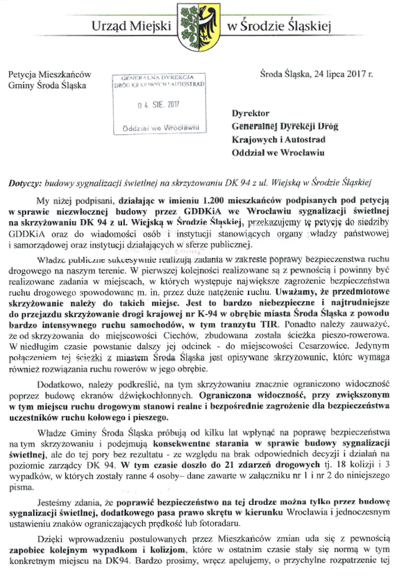 Do siedziby GDDKiA we Wrocławiu trafiła petycja mieszkańców i władz Gminy ws. budowy sygnalizacji świetlnej na skrzyżowaniu DK 94 w kierunku Ciechowa.