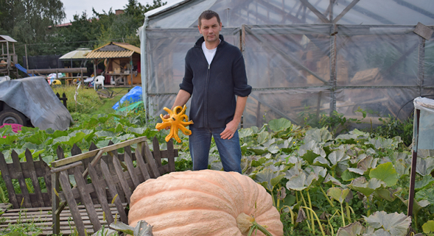 Sołtys Gądowa i Jaszkotla - Marek Kuzdrowski - w swoim ogrodzie wyhodował olbrzymią dynię. Pestki tego typu gigantów kosztują nawet 10 tysięcy złotych.