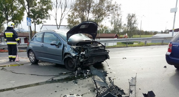 Zderzyły się pojazdy marki Volkswagen Passat i Peugeot. - Pasażer z z samochodu marki Peugeot uskarżał się na ból w klatce piersiowej i kręgosłupa. Przybyli na miejsce zdarzenia strażacy udzielili kwalifikowanej pierwszej pomocy osoie poszkodowanej - ustabilizowali odcinek szyjny. Odłączono akumulatory w pojazdach i za pomocą sorbentu zneutralizowano rozlane płyny eksploatacyjne - informuje rzecznik prasowy Państwowej Straży Pożarnej w Środzie Śląskiej Dariusz Domaradzki.