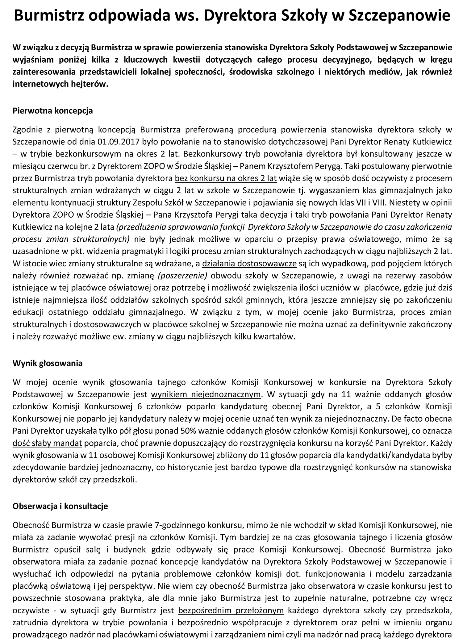 Poniżej pierwsza część odpowiedzi burmistrza Środy Śląskiej na pytania radnych dotyczące powołania na rok dyrektor szkoły w Szczepanowie.