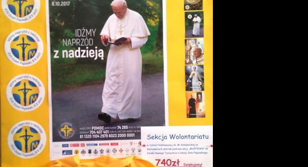 Uczniowie przybliżyli obecnym na Eucharystii najważniejsze fakty z życia Jana Pawła II i Jego refleksje o nadziei. Poprzez wiersze i piosenki ukazali widzom obraz niestrudzonego pielgrzyma, orędownika pokoju i miłości, człowieka, który lubił chodzić po górskich szlakach oraz mistrza, który zachęcał nas do życia w świętości. Oddali główną myśl tegorocznego hasła Dnia Papieskiego, by iść przez życie z nadzieją i zaufać Bogu. Inscenizację uświetniły pieśni religijne przy akompaniamencie instrumentów: gitary i skrzypiec. W tym dniu zbierano również pieniądze na fundusz stypendialny Fundacji "Dzieło Nowego Tysiąclecia".