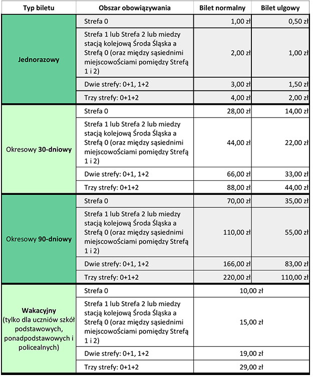 W trakcie sesji ustalono ceny za poszczególne bilety. Jednorazowy w strefie "zero" wyniesie 1 zł oraz 50 groszy w przypadku przysługującej ulgi. Za dojazd do stacji PKP ze Środy Śląskiej zapłacimy 2 zł (normalny) lub 1 zł (ulgowy). Tyle samo wyniesie nas podróżowanie po strefach "pierwszej" i "drugiej". Ale! Jeśli będziemy chcieli przejechać ze strefy "zero" do "pierwszej" (poza PKP), lub z "drugiej" do "trzeciej" wówczas zapłacimy 3 zł (normalny), lub 1.5 zł (ulgowy). Podróżowanie po trzech strefach to koszt 4 zł (normalny), 2 zł ulgowy. Warto zatem zaopatrzyć się w mapę stref.