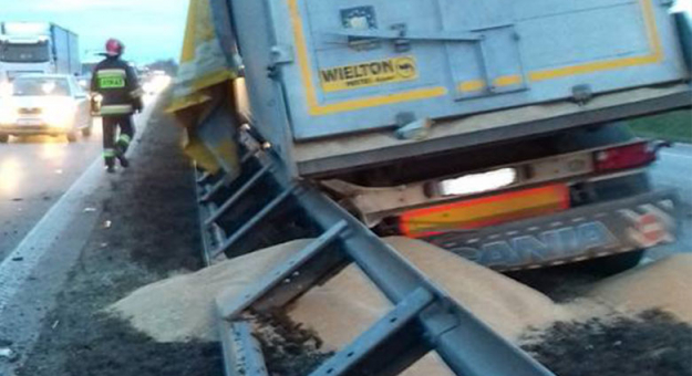 Samochód ciężarowy SCANIA z naczepą uderzył w barierę energochłonną. Zboże znajdujące się w naczepie wysypało się na jezdnię. - Ruch w tym miejscu był utrudniony. Kierowca na miejscu został przebadany przez pogotowie ratunkowe, które nie stwierdziło poważniejszych obrażeń. Nasze działania polegały na zabezpieczeniu miejsca zdarzenia i odłączeniu zasilania w samochodzie. - informuje oficer prasowy Komendanta Miejskiego PSP we Wrocławiu Mariusz Urbaniak.