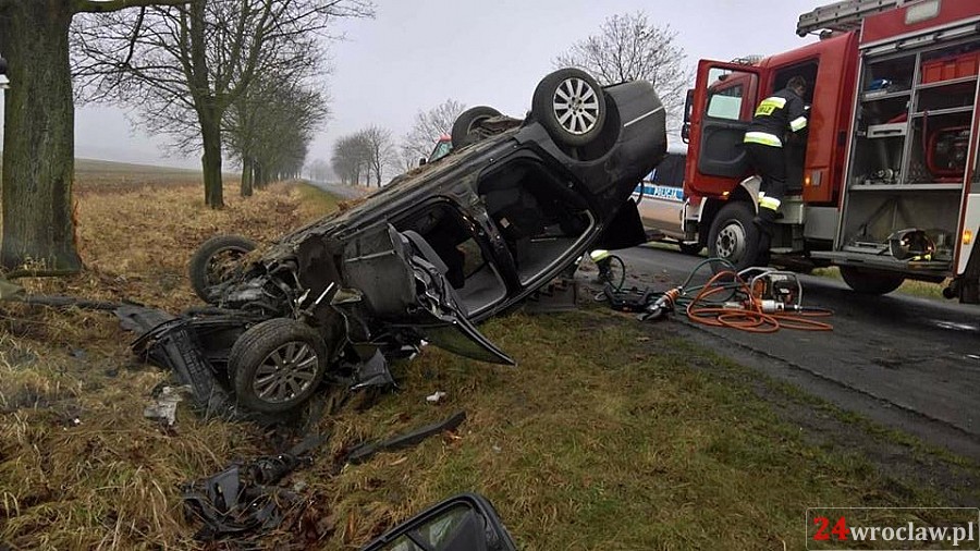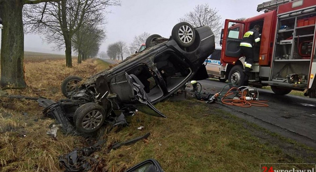 Samochód osobowy marki volkswagen uderzył w drzewo i dachował. Kierowcą auta była około 30 -letnia kobieta, która była uwięziona w rozbitym samochodzie. Ze złamaniem nogi została przetransportowana przez pogotowie ratunkowe do szpitala. Droga w tym miejscu była całkowicie zablokowana - Działania straży polegały za zabezpieczeniu miejsca zdarzenia, uwolnieniu osoby poszkodowanej oraz udzieleniu jej kwalifikowanej pierwszej pomocy - informuje Dariusz Domaradzki rzecznik PSP Środa Śląska.