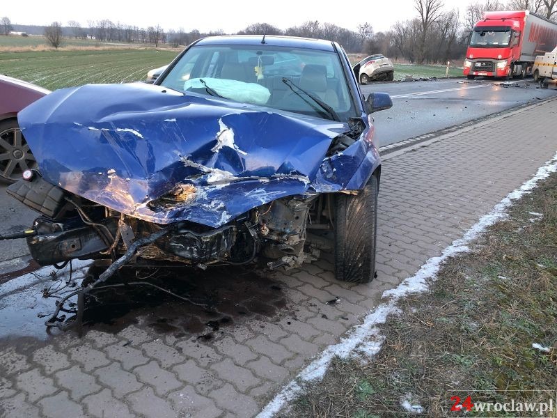 W miejscowości Pełcznica na łuku drogi doszło do zdarzenia z udziałem trzech pojazdów. Jednego samochodu ciężarowego i dwóch samochodów osobowych, które to zderzyły się czołowo. Uszkodzeniu uległy przody pojazdów osobowych oraz tył naczepy pojazdu ciężarowego. Ciężarówka znajdowała się na pasie jezdni, jedna z osobówek znajdowała się w przydrożnym rowie na kołach, druga zaś częściowo na chodniku i jezdni. W pojazdach znajdowały się cztery osoby, w tym dziecko w wieku około 4 lat. Trzy osoby same opuściły pojazdy, nasi ratownicy udzielili im kwalifikowanej pierwszej pomocy przed przybyciem ratownictwa medycznego. Dziecko zostało przekazane matce wraz z fotelikiem do pojazdu, którym przyjechała na miejsce zdarzenia. Ruch w tym miejscu był wstrzymany. Nasze działania polegały na zabezpieczeniu miejsca zdarzenia, zneutralizowania płynów eksploatacyjnych, odłączeniu akumulatorów. Na miejscu działała policja, pogotowie ratunkowe oraz dwie jednostki JRG z Kątów Wrocławskich. - informuje mł. bryg. Mariusz Piasecki Oficer Prasowy Komendanta Miejskiego PSP we Wrocławiu.