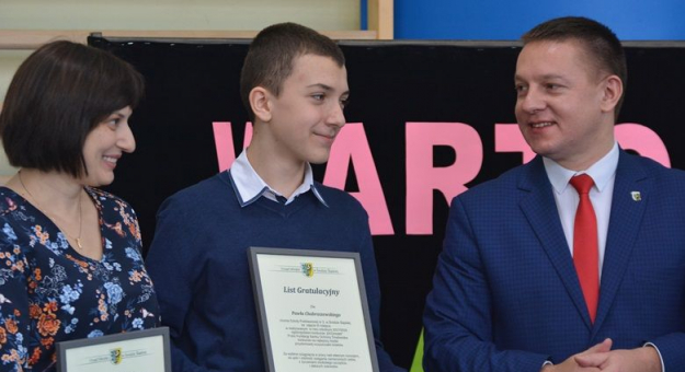 Na czwartkowym apelu w szkole podstawowej Paweł otrzymał list gratulacyjny od Urzędu Miejskiego w Środzie Śląskiej za godne reprezentowanie szkoły i gminy. Prezent i list dla ucznia i jego rodziców wręczył burmistrz Adam Ruciński.