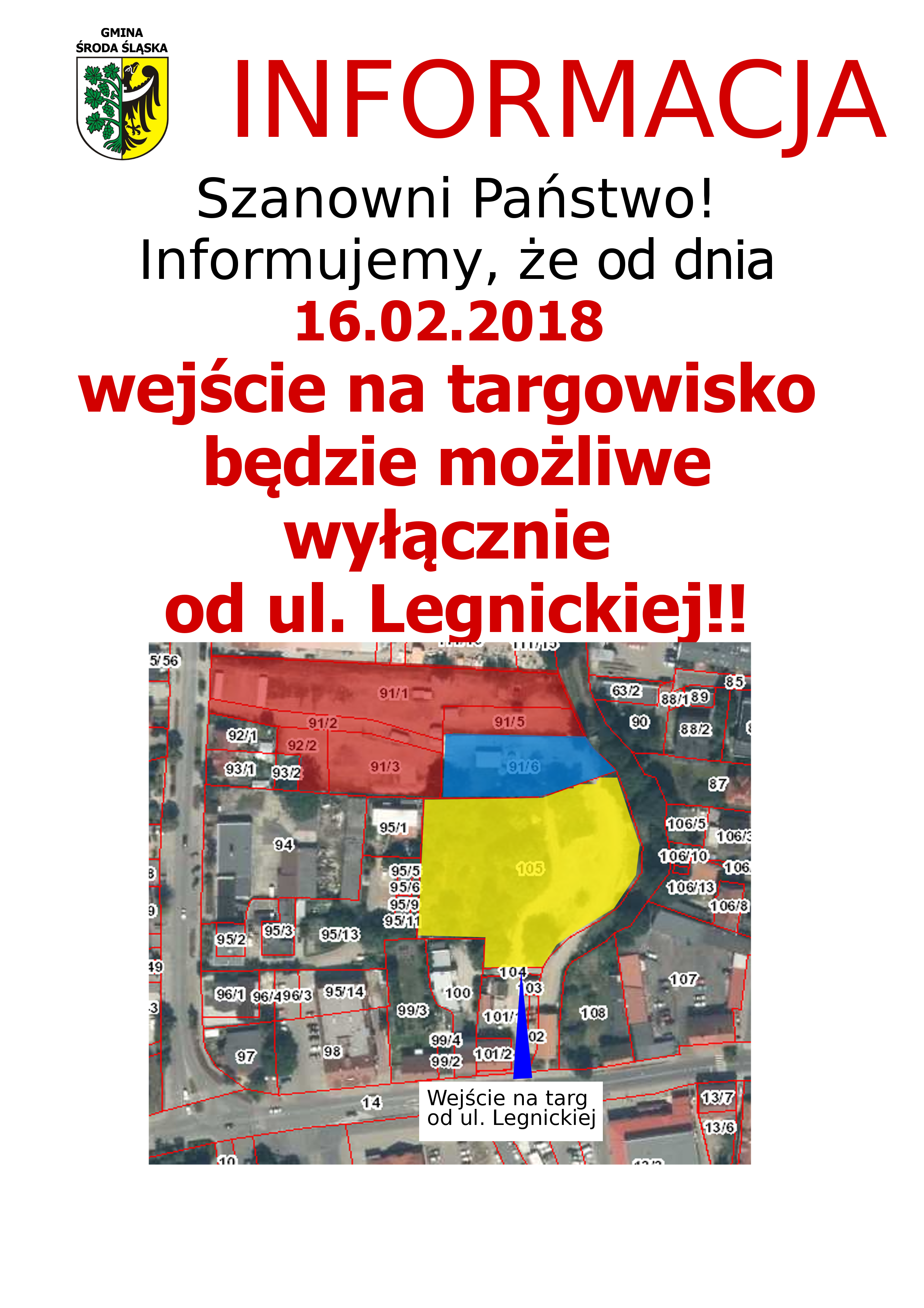 W związku z rozpoczynającymi się pracami budowlanymi na targowisku w Środzie Śląskiej, wejście na teren od 16 lutego będzie możliwy wyłącznie od ulicy Legnickiej.