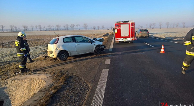 Samochód osobowy wypadł z drogi, wjechał do rowu i uderzył w przepust drogowy. Osobom, które podróżowały autem, nic się nie stało. Przybyli na miejsce strażacy zabezpieczyli miejsce zdarzenia i odłączyli akumulator w pojeździe. W akcji wzięły udział jednostki ze Środy Śląskiej, Kątów Wrocławskich i Kostomłotów.
