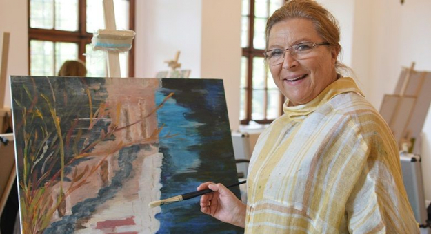 Kobiety w ciągu tygodnia w zamku miały zajęcia w ramach pleneru malarskiego. - Przyjechaliśmy tutaj, ponieważ zamek, jak i jego otoczenie zachwyca - mówi w rozmowie z nami lek. Katarzyna Bartz-Dylewicz. - Jesteśmy lekarzami z Wielkopolskiej Izby Lekarskiej. Nasze koło malarskie liczy około 15 osób. Część członków jest jeszcze aktywnych zawodowo. Jednak przede wszystkim są to osoby, które wyciszają się zawodowo. Zaczęłyśmy myśleć o malarstwie jako o formie innej wypowiedzi. Nasze doświadczenia mają przełożenie na malarstwo. Może wydawać się to relaksujące, ale dla nas jest też sporym stresem, zwłaszcza przez fakt jak znamienite osobowości gościł zamek w Wojnowicach - wyjaśnia lekarka.