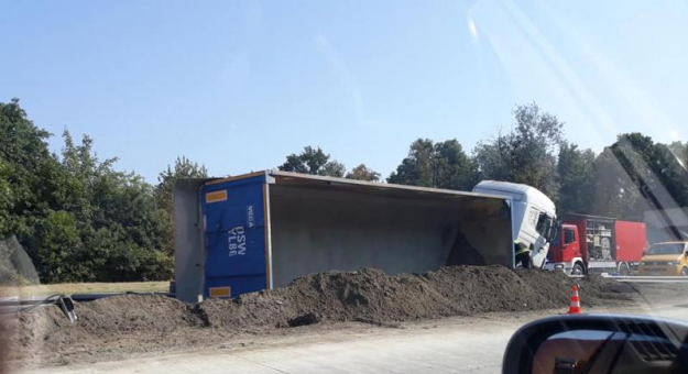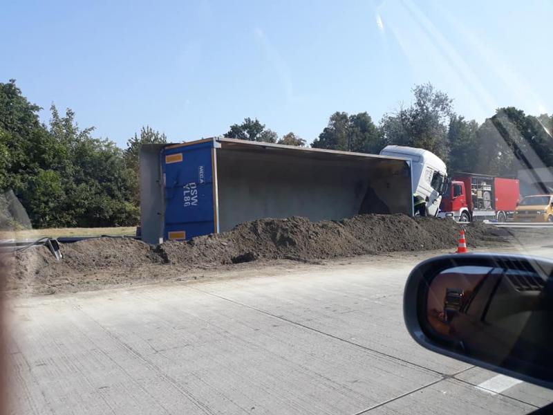 Pomiędzy zjazdami Kąty Wrocławskie-Pietrzykowice dochodzi do zdarzenia drogowego. - W samochodzie ciężarowym marki Scania pęka opona, samochód ciężarowy uderza w barierki i przewraca się na bok, a materiał sypki, który był przewożony, rozsypuje się na wszystkie cztery pasy. Autostrada była nieprzejezdna do godziny 9.50. Jadący za ciężarówką samochód osobowy marki Volvo, aby uniknąć zderzenia z nią, uciekł na bok i uderzył w barierkę. Nikomu na szczęście się nic nie stało. Kierowcy trzeźwi. W tej chwili przejezdny jest jeden pas ruchu w stronę Wrocławia. Natomiast w kierunku Legnicy wytyczone są objazdy. - informuje sierżant Dariusz Rajski z dolnośląskiej policji.
