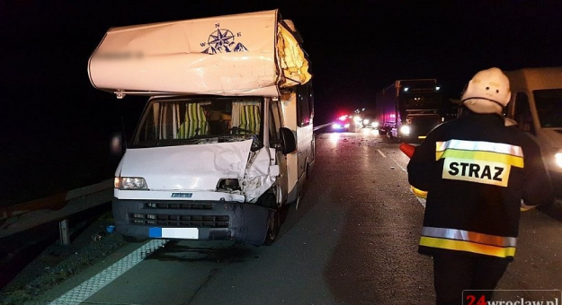 Kierujący kamperem uderzył w tył autokaru. - W wyniku zderzenia poszkodowane zostały trzy osoby. Mężczyzna w wieku 27 lat oraz dwie kobiety w wieku 16 i 17 lat. Poszkodowani uskarżali się na bóle w odcinku szyjnym - informuje Dariusz Domaradzki rzecznik Państwowej Straży Pożarnej w Środzie Śląskiej.