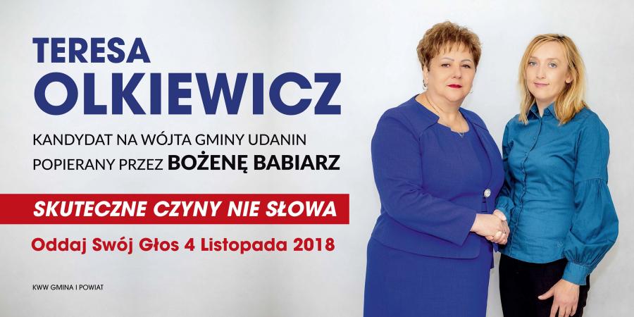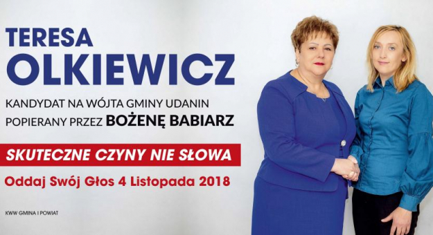 Kandydatką na wójta gminy Udanin jest Teresa Olkiewicz, która piastowała to stanowisko przez ostatnie lata. O głosy wyborców powalczy w drugiej turze - 4 listopada.