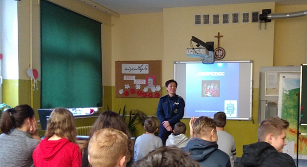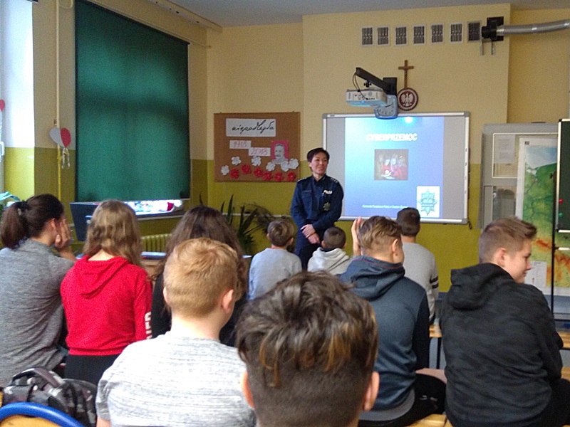 Młodzież obejrzała prezentację multimedialną przedstawiającą zasady korzystania z Internetu, przybliżającą zagrożenia, jakie mogą spotkać młodych użytkowników. Policjantka zwracała uwagę, jakiego rodzaju zachowania w Internecie są niewłaściwe, a tym samym, jakiego rodzaju konsekwecje mogą za nie grozić. Uczniowie zadawali pytania, a także opowiadali o własnych doświadczeniach związanych m.in. z zawieraniem znajomości w sieci.