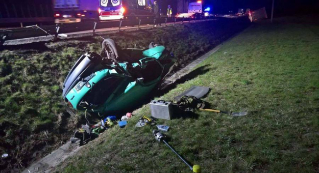 Na autostradzie zderzył się samochód osobowy marki Opel z ciężarowym marki Scania. W wyniku uderzenia osobówka dachowała i wpadła do rowu. Pojazd ciężarowy zsunął się z jezdni do rowu i przewrócił na bok.