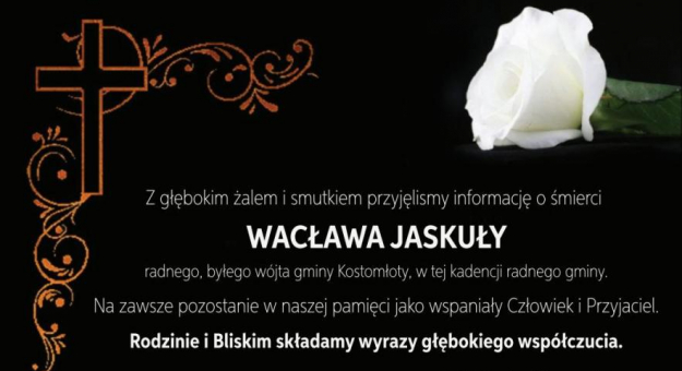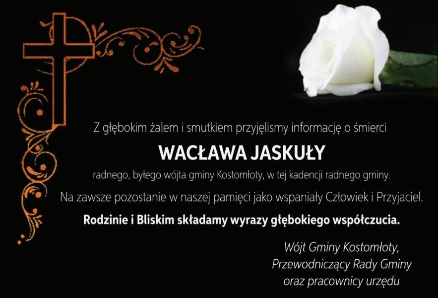 Wójt gminy Kostomłoty Janina Gawlik, Przewodniczący Rady Gminy oraz pracownicy urzędu składają kondolencje rodzinie i bliskim zmarłego Wacława Jaskuły.