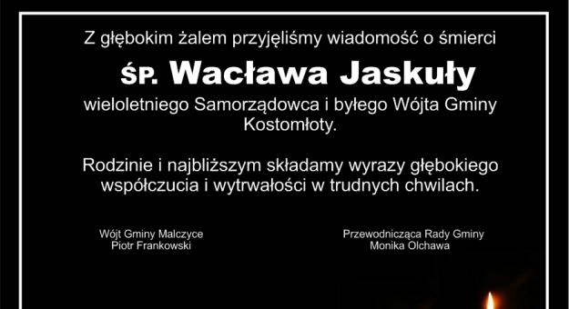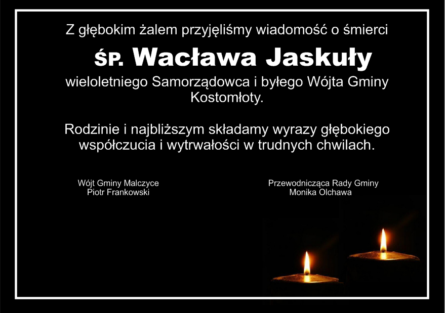 Wójt gminy Piotr Frankowski oraz Przewodnicząca Rady Gminy Monika Olchawa składają kondolencje rodzinie i bliskim zmarłego Wacława Jaskuły.