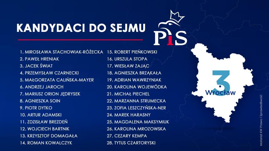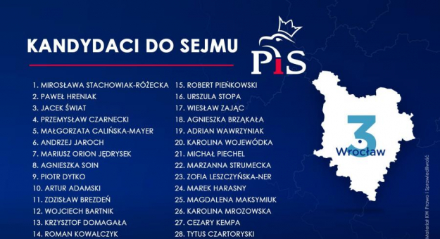 "Jedynką" w okręgu wrocławskim, pod który podlega powiat średzki, jest Mirosława Stachowiak-Różecka. Zaraz za nią na liście znalazł się obecny wojewoda Paweł Hreniak. Pełne zestawienie kandydatów do Sejmu na grafice poniżej. O mandat w Senacie (okręg nr 6) ubiegać się będzie Jarosław Obremski.