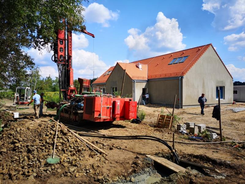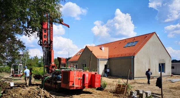 W ostatnim tygodniu zakończono m.in. wykonywanie 5 odwiertów do pompy ciepła, a wewnątrz trwają prace tynkarskie.