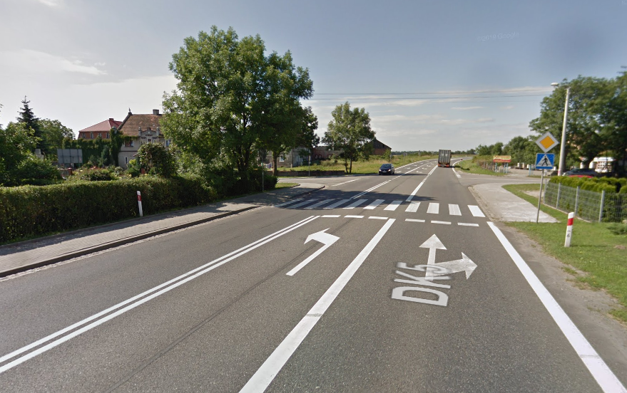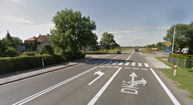Skrzyżowanie w Osieku. Pas do skrętu w lewo zostanie zlikwidowany. W tym miejscu powstanie wyspa z przejściem dla pieszych fot.: google maps