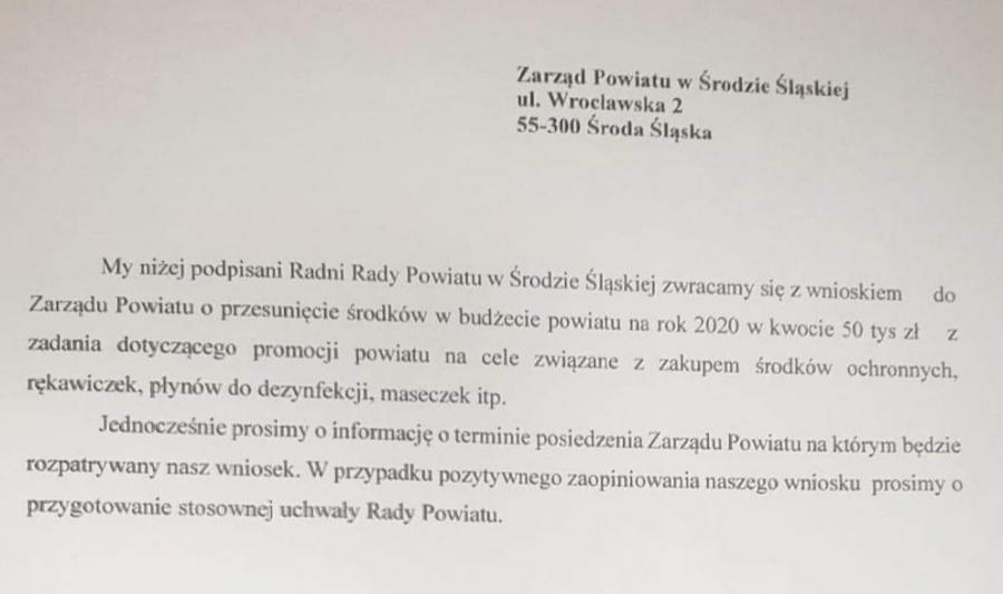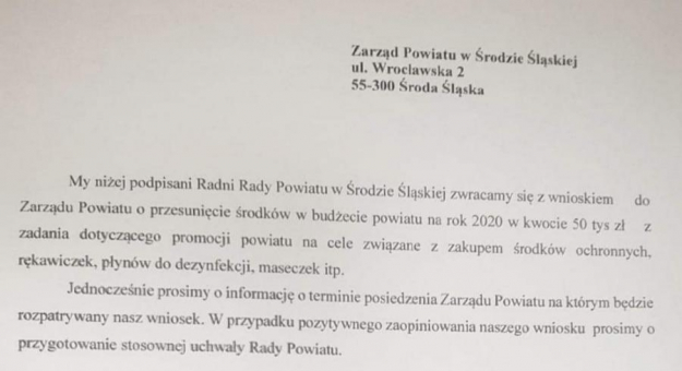 Dziś także część radnych powiatu (8 osób) złożyła wniosek o przekazanie z budżetu powiatu (konkretnie z wydziału promocji) 50 tys. złotych na rzecz zakupu dla ratowników środków ochronnych, rękawiczek, płynów do dezynfekcji, maseczek itp.