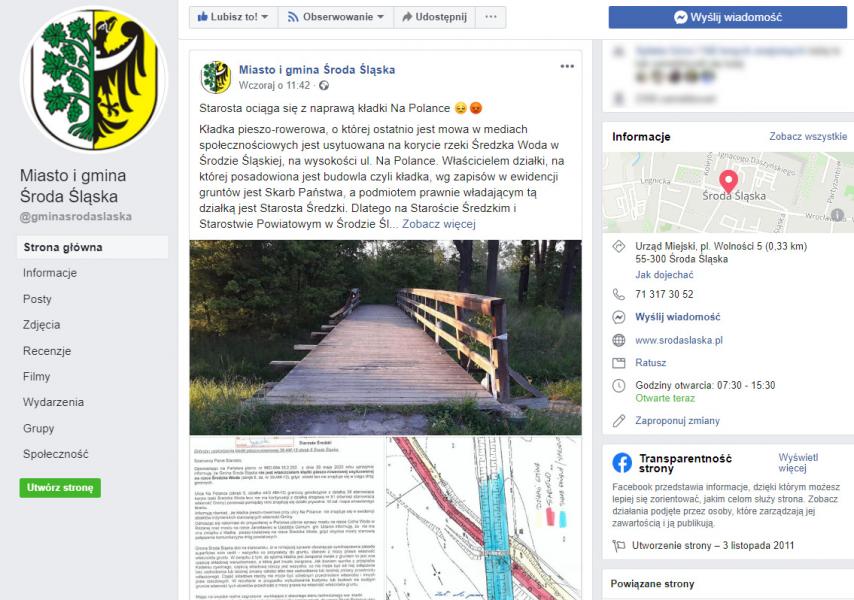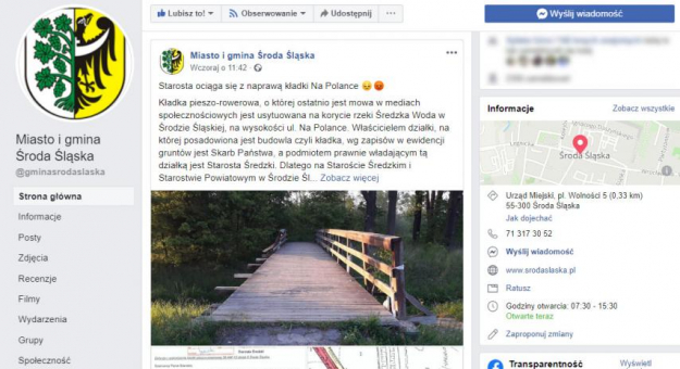 15 czerwca na portalu społecznościowym, na oficjalnej stronie urzędu miejskiego, ukazał się post "Starosta ociąga się z naprawą kładki Na Polance".