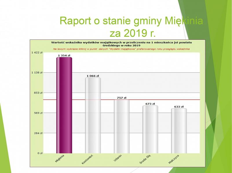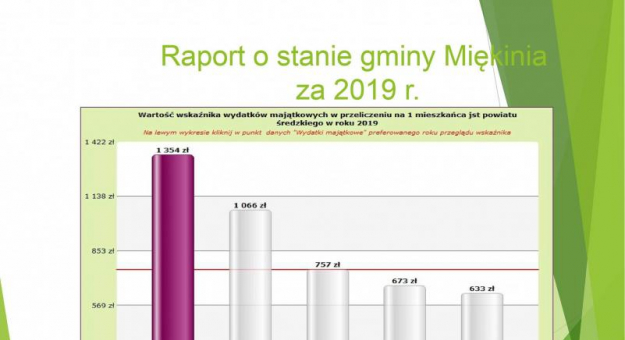 - Co cieszy - stale wzrasta nam liczba mieszkańców. Na koniec ubiegłego roku wynosiła 16.212 osób zameldowanych na pobyt stały - mówiła. Poinformowała również, że przychody gminy osiągnęły poziom 105,4 mln złotych, a wydatki 95,2 mln złotych, z czego 21,9 mln przeznaczono na inwestycje. Z zaprezentowanego przez skarbnika Czesława Osieckiego porównania z innymi samorządami wynika, że w przeliczeniu na jednego mieszkańca gmina Miękinia w 2019 roku wydała najwięcej (1.354 zł, tabelka poniżej).