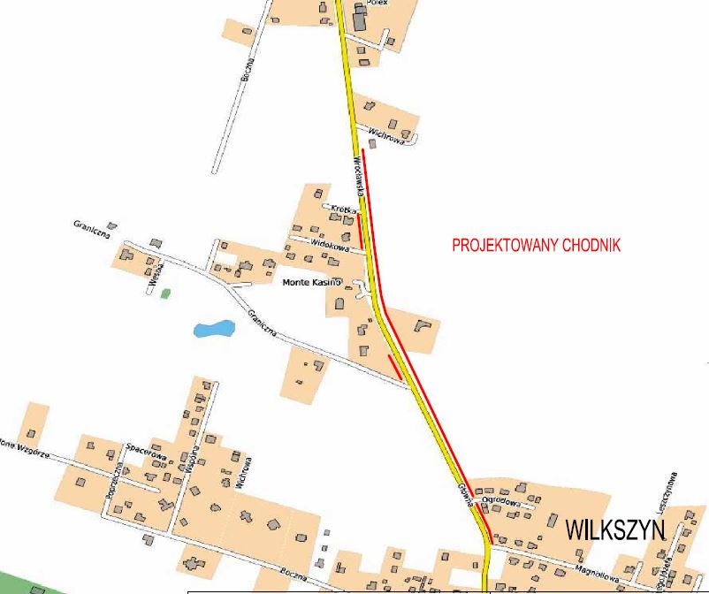 Blisko kilometrowy odcinek chodnika powstanie wzdłuż drogi gminnej nr 104914D. Chodnik o szerokości 215 cm połączy istniejący ciąg pieszy przy ul. Wrocławskiej w Pisarzowicach i przebiegać będzie do skrzyżowania ul. Głównej z Magnoliową w Wilkszynie. Inwestycje uzupełnią fragmenty chodnika pomiędzy ul. Krótką i Widokową oraz w okolicy ul. Granicznej. Docelowa organizacja ruchu przewiduje powstanie dwóch przejść dla pieszych.