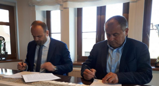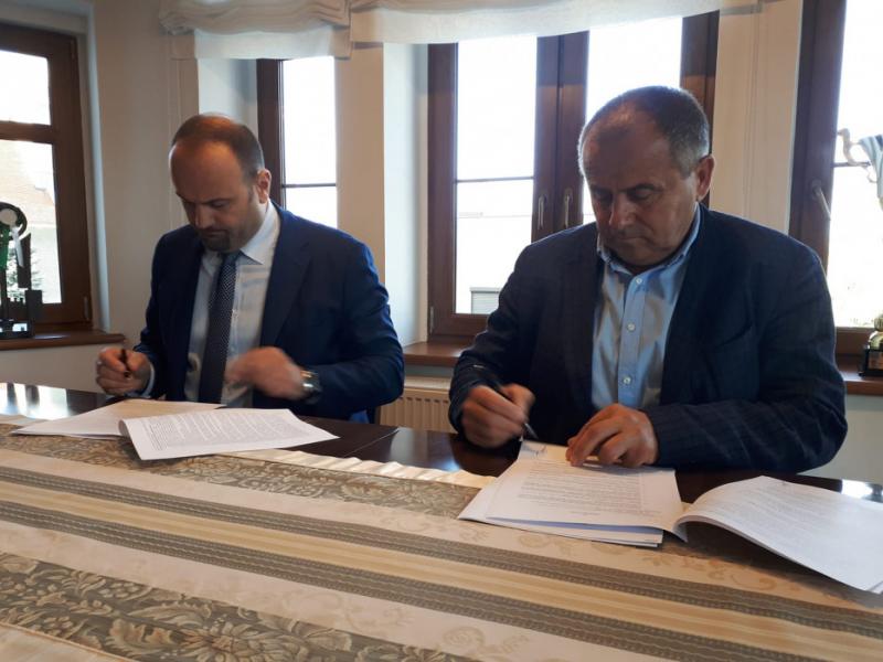 Jan Marian Grzegorczyn wójt gminy Miękinia oraz Grzegorz Serafin Prokurent firmy BERGER BAU POLSKA podpisali umowę na realizację kolejnych inwestycji drogowych.